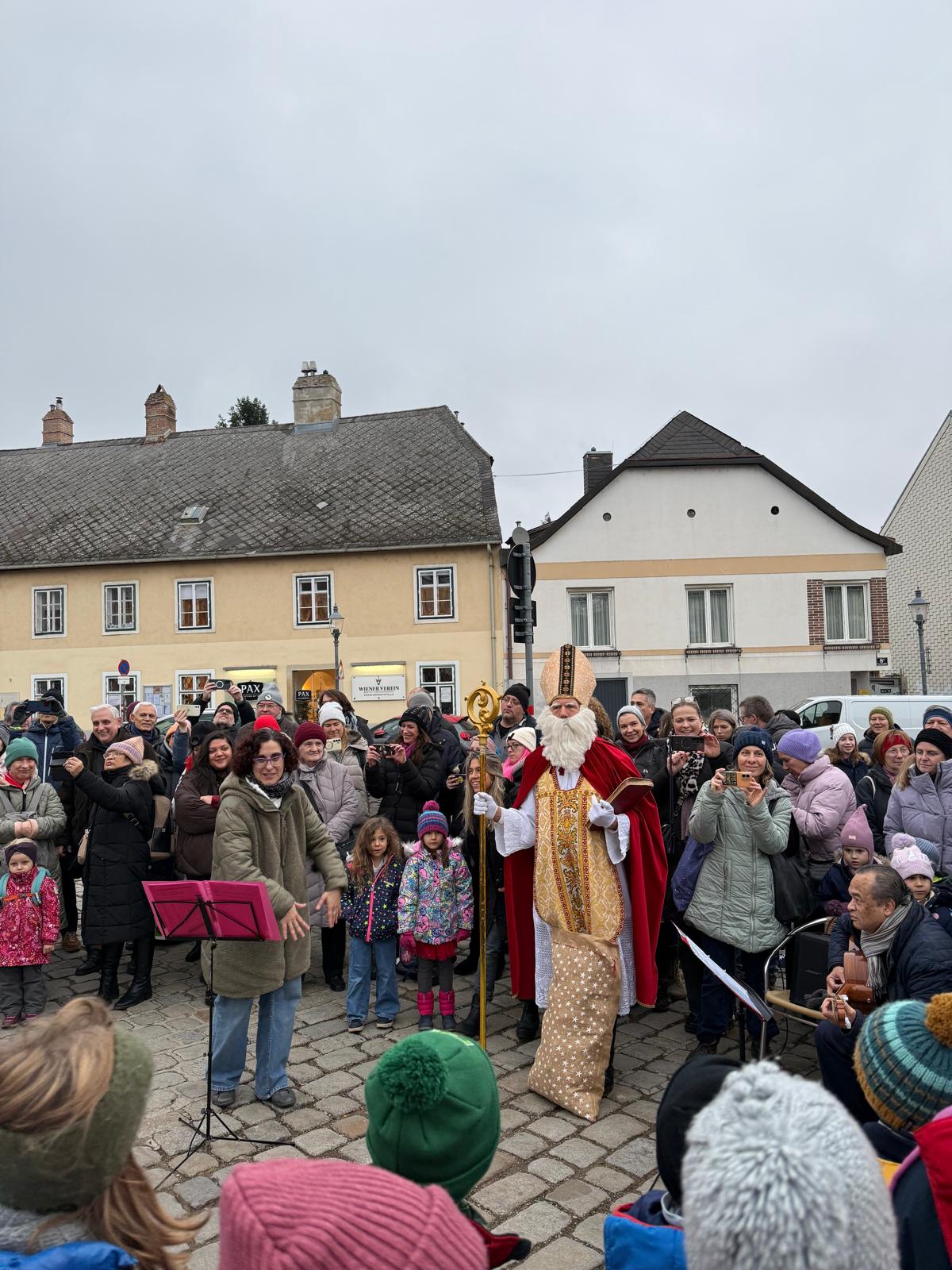 Danach singt am Maurer Hauptplatz der Kinderchor der Musikschule Bendagasse Weihnachtslieder und der Nikolo verteilt kleine Süßigkeiten (solange der Vorrat reicht) und sorgt für strahlende Gesichter.